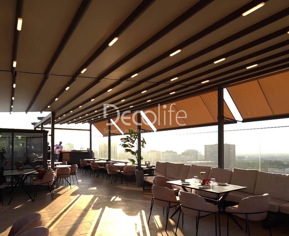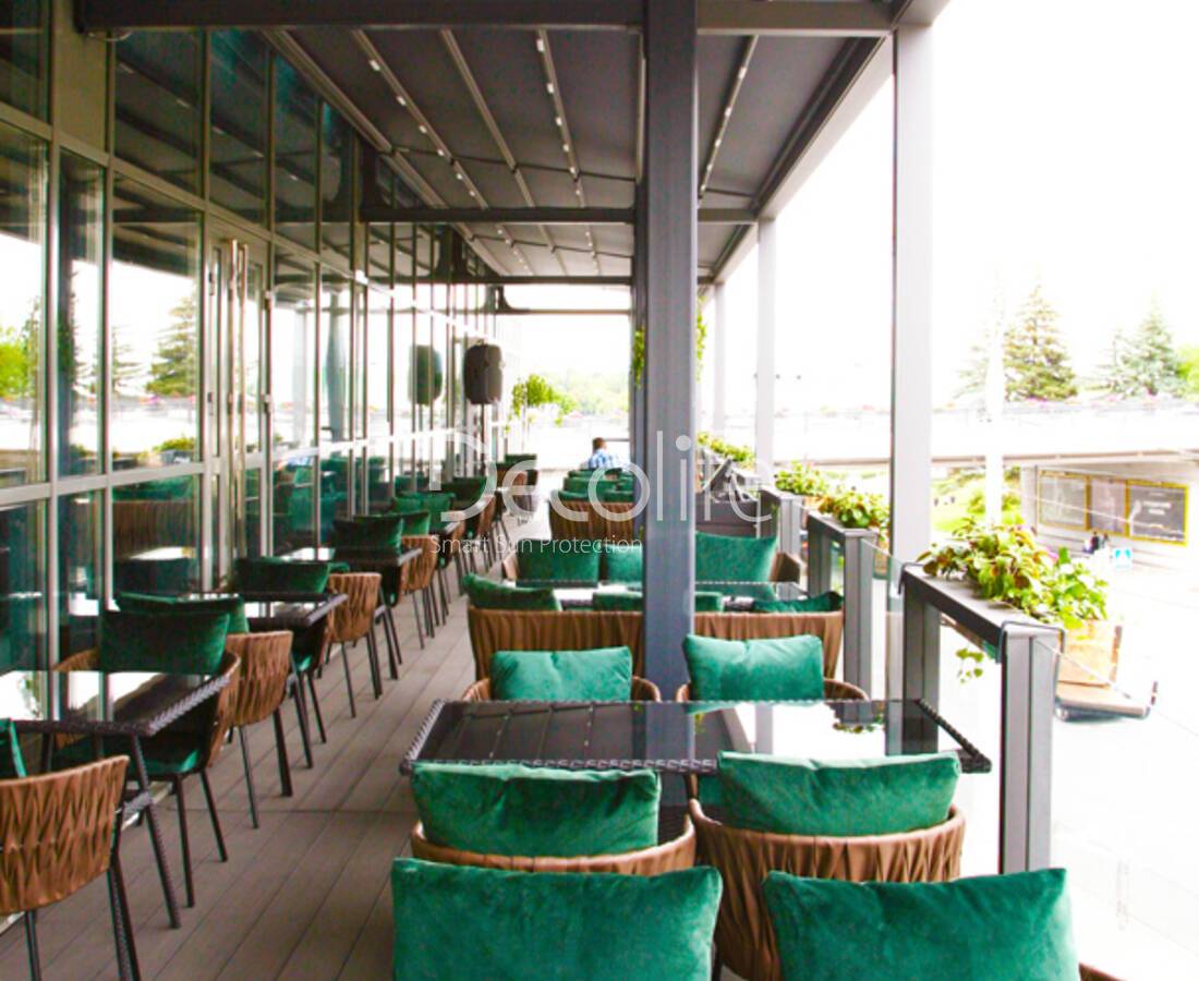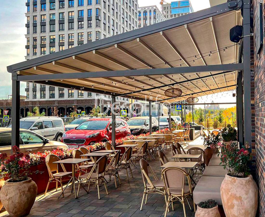 Тентовая пергола Decolife Basic&Pro New, объект реализован партнером ООО "СТЕЛЛ МС" - г. Казань, "Begin Cafe"