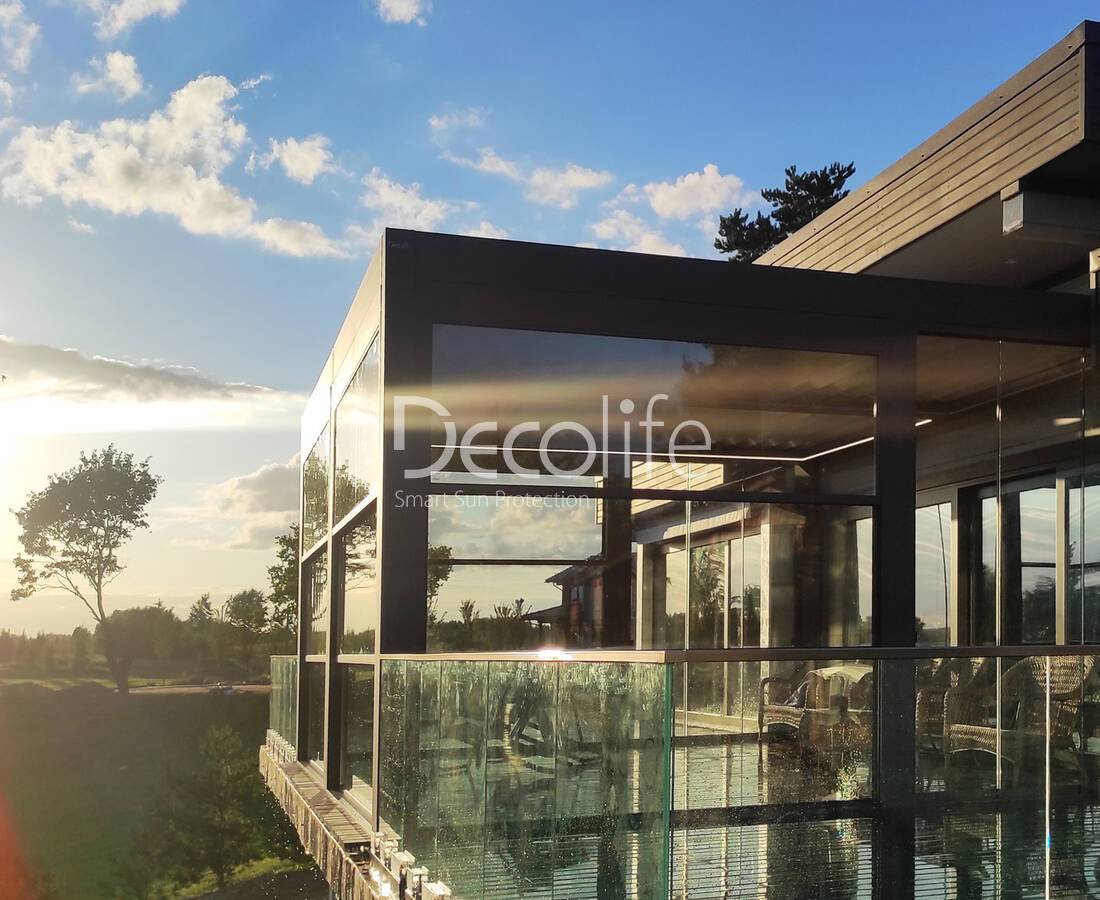 Пергола Decolife B600 PIR + Фасадные жалюзи FZ-44 + Гильотинное W500 и раздвижное S200 остекление - г. Минск